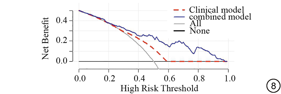 图8  SVM联合模型的决策曲线。当纵坐标为净收益,横坐标为阈值概率。当阈值在0.3左右时,联合模型获得的净收益大于临床模型。SVM:支持向量机。