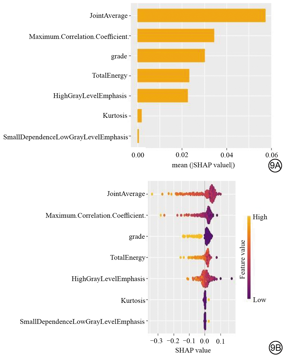 三种联合模型中SVM的校正曲线拟合度较好(图7)。决策曲线显示当阈值在0.3左右时,联合模型的净收益大于临床模型(图8)。根据SHAP值排序显示,联合模型中联合平均特征对模型的贡献度最大,其次是最大相关系数特征、组织学分级、总体能量特征、高灰度值强调特征、峰度特征、小依赖低灰度强调特征(图9)。