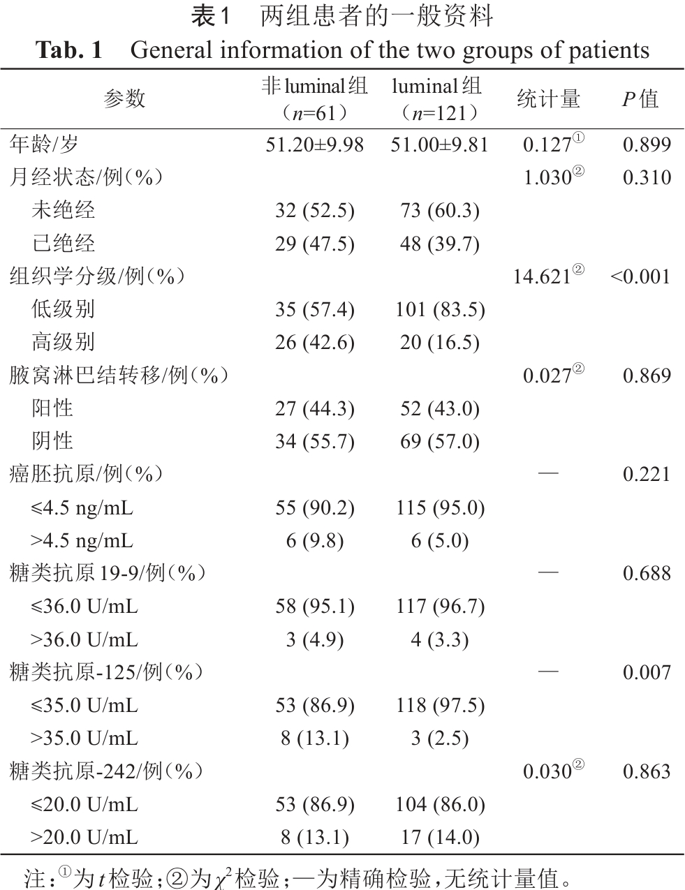 在luminal组和非luminal 组中年龄分别为(51.00±9.81)和(51.20±9.98)岁。年龄、腋窝淋巴结转移、月经状态在两组之间差异无统计学意义(P>0.05)。组织学分级、糖类抗原-125在两组之间差异有统计学意义(P<0.05)(表1)。