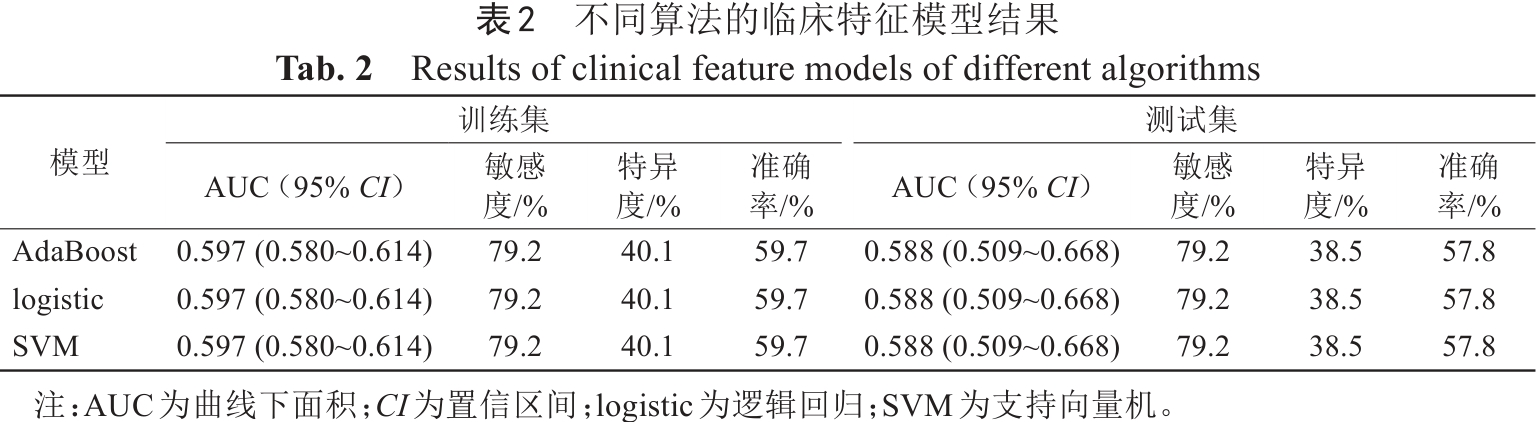 基于组织学分级的logistic、SVM、AdaBoost临床特征模型,在训练集的AUC均为0.597,敏感度均为79.2%,特异度均为40.1%,准确率均为59.7%;在测试集的AUC均为0.588,敏感度均为79.2%,特异度均为38.5%,准确率均为57.8%(表2)。