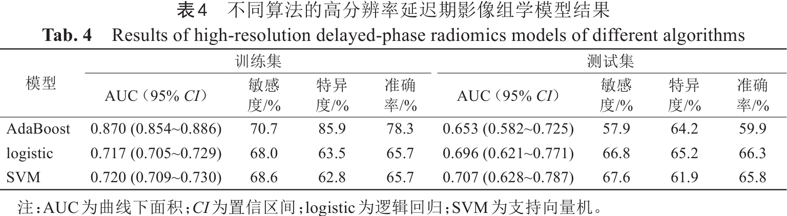 表4  不同算法的高分辨率延迟期影像组学模型结果