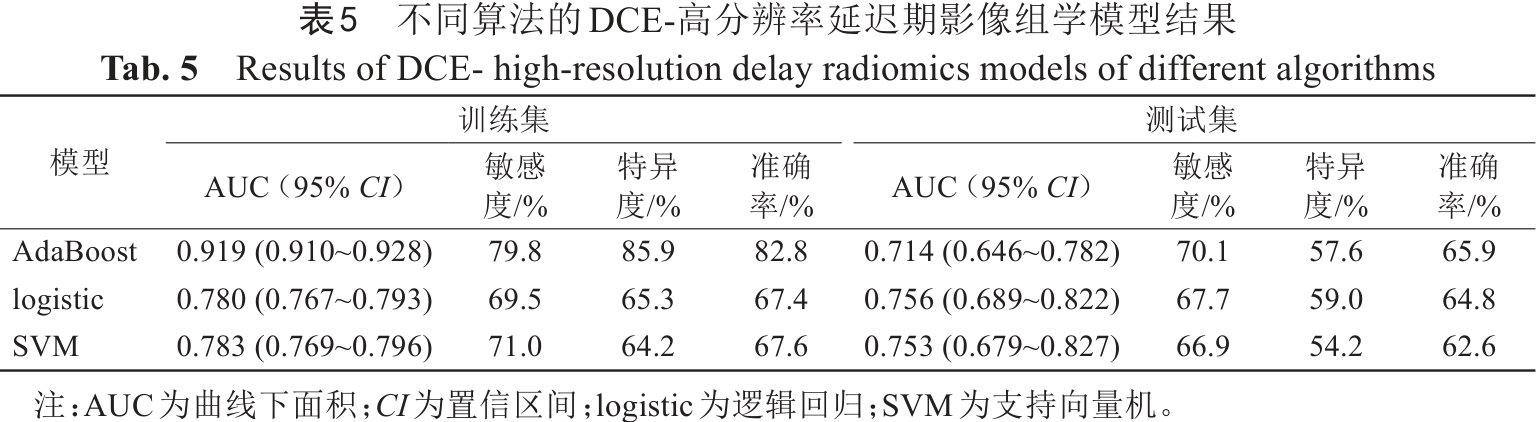基于DCE-高分辨率延迟期的影像组学特征logistic、SVM、AdaBoost模型在训练集的AUC分别为0.780、0.783、0.919,敏感度分别为69.5%、71.0%、79.8%,特异度分别为65.3%、64.2%、85.9%,准确率分别为67.4%、67.6%、82.8%;在测试集的AUC分别为0.756、0.753、0.714,敏感度分别为67.7%、66.9%、70.1%,特异度分别为59.0%、54.2%、57.6%,准确率64.8%、62.6%、65.9%(表5)。