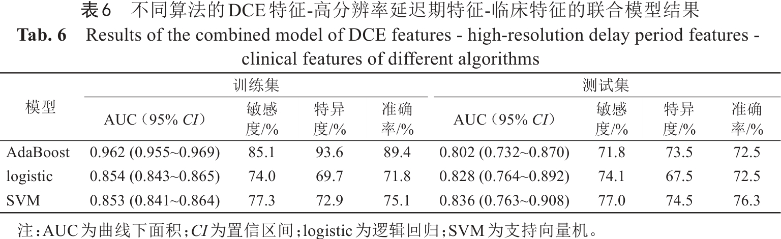 基于DCE特征-高分辨率延迟期特征-临床特征的联合模型logistic、SVM、AdaBoost在训练集的AUC分别为0.854、0.853、0.962,敏感度分别为74.0%、77.3%、85.1%,特异度分别为69.7%、72.9%、93.6%,准确率分别为71.8%、75.1%、89.4%;在测试集的AUC分别为0.828、0.836、0.802,敏感度分别为74.1%、77.0%、71.8%,特异度分别为67.5%、74.5%、73.5%,准确率分别为72.5%、76.3%、72.5%(表6)。