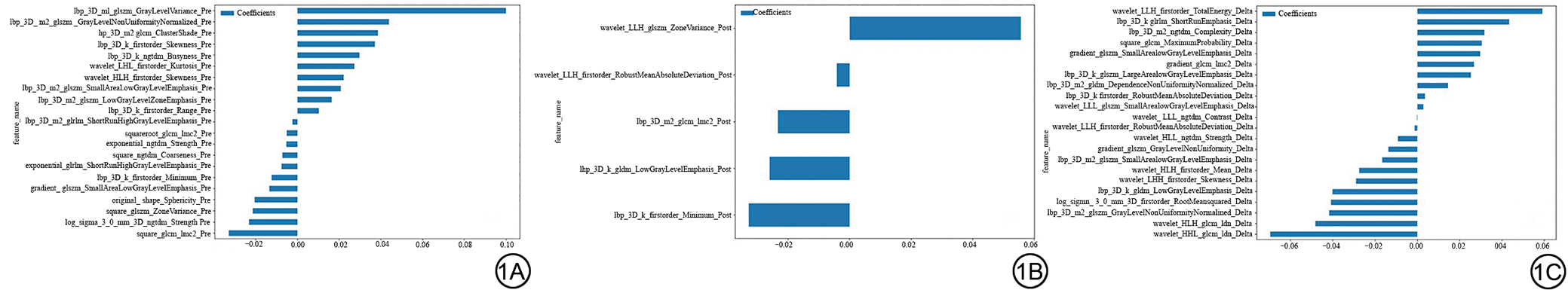 Fig. 1  Correlation coefficient plot of features used for model construction. 1A: T1WI model; 1B: Hepatobiliary phase (HBP) model; 1C: Delta model.