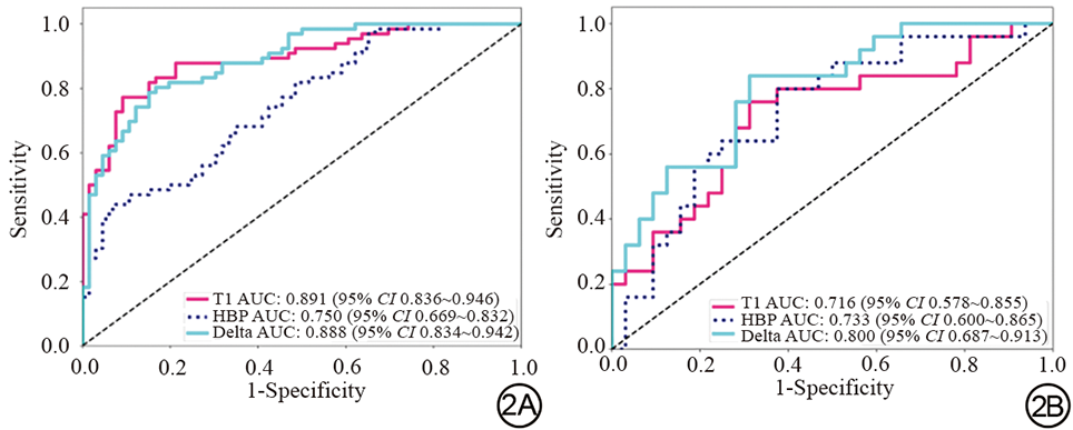 图2  T1WI、HBP、Delta模型在训练集(2A)和验证集(2B)的ROC权限。HBP:肝胆期;ROC:受试者工作特征;AUC:曲线下面积;CI:置信区间。