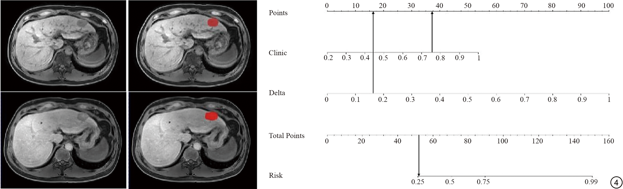 钆塞酸二钠(gadolinium ethoxybenzyl diethylenetriamine pentaacetic acid, Gd-EOB-DTPA)是一种肝特异性对比剂,与常规MR对比剂比较,肿瘤组织与周围肝实质在增强扫描肝胆期(hepatobiliary phase, HBP)图像上的信号强度差异更明显,肿瘤的边界更清晰,其还可能反映肿瘤边缘病理特征[6, 7, 8]。影像组学可以提取高通量图像特征,并转换为定量数据进行分析,深入挖掘丰富信息,以研究肿瘤的生物学行为。既往多项研究将影像组学模型应用于HCC的MVI术前诊断,然而这些研究集中于从一个或多个单序列或时相的图像中提取特征构建模型[9, 10]。Delta影像组学将不同时间点获取的影像进行对比,识别和量化图像中的差别,可为疾病诊断、治疗和预后评估提供更多信息[11]