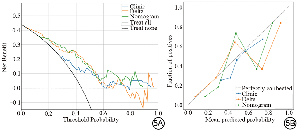 图5  临床模型、Delta模型、联合模型验证集的决策曲线(5A)及校准曲线(5B)。