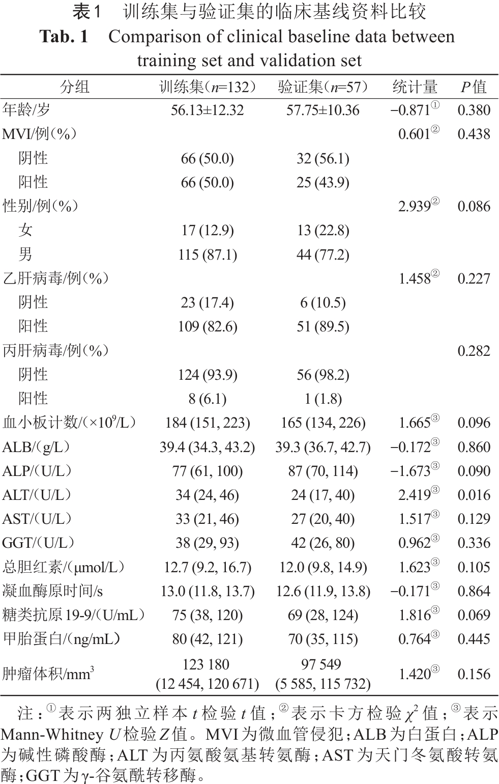病理资料包括在显微镜下获得肿瘤病理类型和MVI信息,由经过培训的病理科医师进行取材诊断,根据我国《原发性肝癌诊疗指南(2024版)》[12]确定MVI定义及分级:M0为未观察到MVI;M1为近癌旁肝组织区域(≤1 cm)出现不超过5个MVI;M2为近癌旁肝组织中出现5个以上MVI,或远癌旁肝组织区域(>1 cm)出现MVI。M0为MVI阴性,M1及M2为MVI阳性。