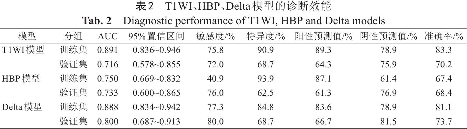 从T1WI、HBP、Delta各1834个特征中,分别筛选出21、5、22个最优特征构建模型(图1)。T1WI、HBP、Delta模型训练集AUC分别为0.891、0.750、0.888,验证集AUC分别为0.716、0.733、0.800。各模型敏感度、特异度等参数详见表2