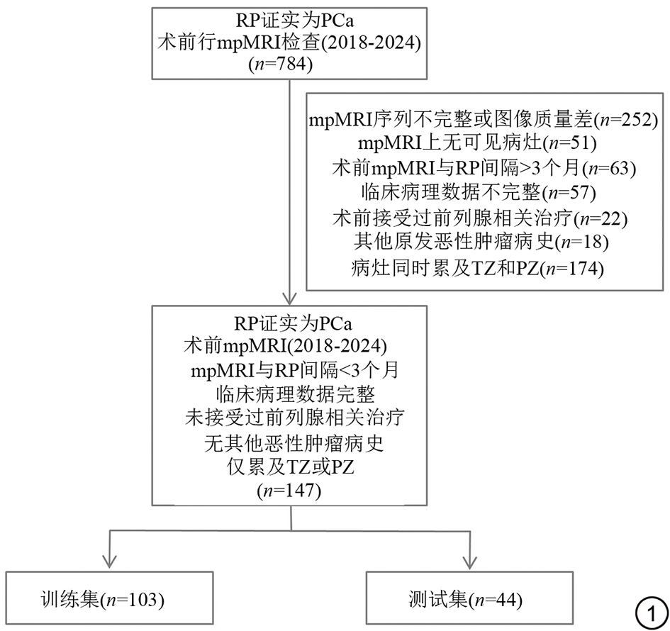 本研究遵守《赫尔辛基宣言》,经西京医院伦理委员会批准,回顾性研究豁免知情同意书,批准文号:KY20242327-C-1。回顾性分析2018年1月至2024年8月西京医院PCa患者的临床、病理和MRI资料(图1)。纳入标准:(1)经根治性前列腺切除术(radical prostatectomy, RP)证实为PCa;(2)术前行多参数磁共振成像(multi-parameteric magnetic resonance imaging, mpMRI)检查。排除标准:(1)mpMRI序列不完整或图像质量差;(2)mpMRI上无可见病灶(直径<5 mm);(3)术前mpMRI与RP间隔超过3个月;(4)临床病理数据不完整;(5)术前接受过前列腺相关治疗;(6)其他原发恶性肿瘤病史;(7)病灶同时累及TZ和PZ。最终纳入147例经RP确诊且病灶局限于PZ或TZ的PCa患者,年龄45~91(68±9)岁,按7∶3分为训练集和测试集。