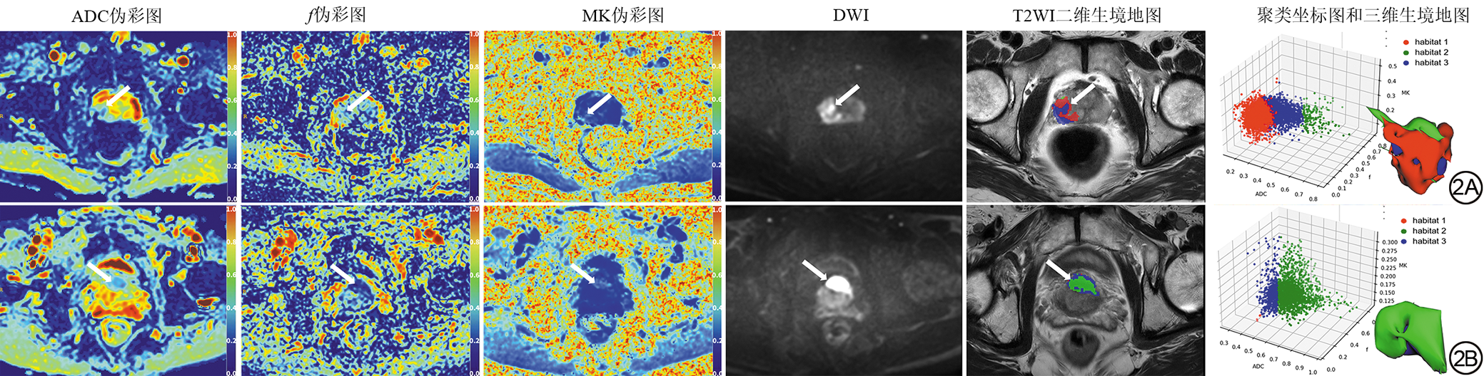 图2  两名临床特征相似PCa患者的HI分析。2A:男,58岁,PZ PCa患者,PSA为6 ng/mL,PI-RADS评分为5,MTD为2.8 cm,生境1占比为54.0%,病理ISUP分级为5;2B:男,66岁,TZ PCa患者,PSA为6.97 ng/mL,PI-RADS评分为5,MTD为2.9 cm,生境1占比为7.0%,病理ISUP分级为2。PCa:前列腺癌;HI:生境成像;PZ:外周区;TZ:移行区;PSA:前列腺特异性抗原;PI-RADS:前列腺影像报告与数据系统;MTD:肿瘤最大径;ADC:表观扩散系数;f:灌注分数;MK:平均峰度;DWI:扩散加权成像。