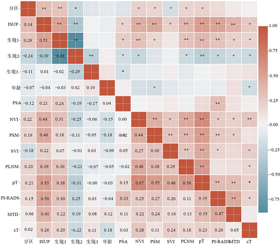 图3  临床、病理和MRI特征间的相关性热图图中数字为相关系数rs1或2个黑色星标标记的区域表示具有显著相关性(P<0.05或P<0.001),正相关用红色表示,负相关用蓝色表示ISUP:国际泌尿生殖病理协会;PSA:前列腺特异性抗原;NVI:神经脉管侵犯;PSM:阳性手术切缘;SVI:精囊腺侵犯;PLNM:盆腔淋巴结转移;pT:病理T分期;PI-RADS:前列腺影像报告与数据系统;MTD:肿瘤最大径;cT:临床T分期。