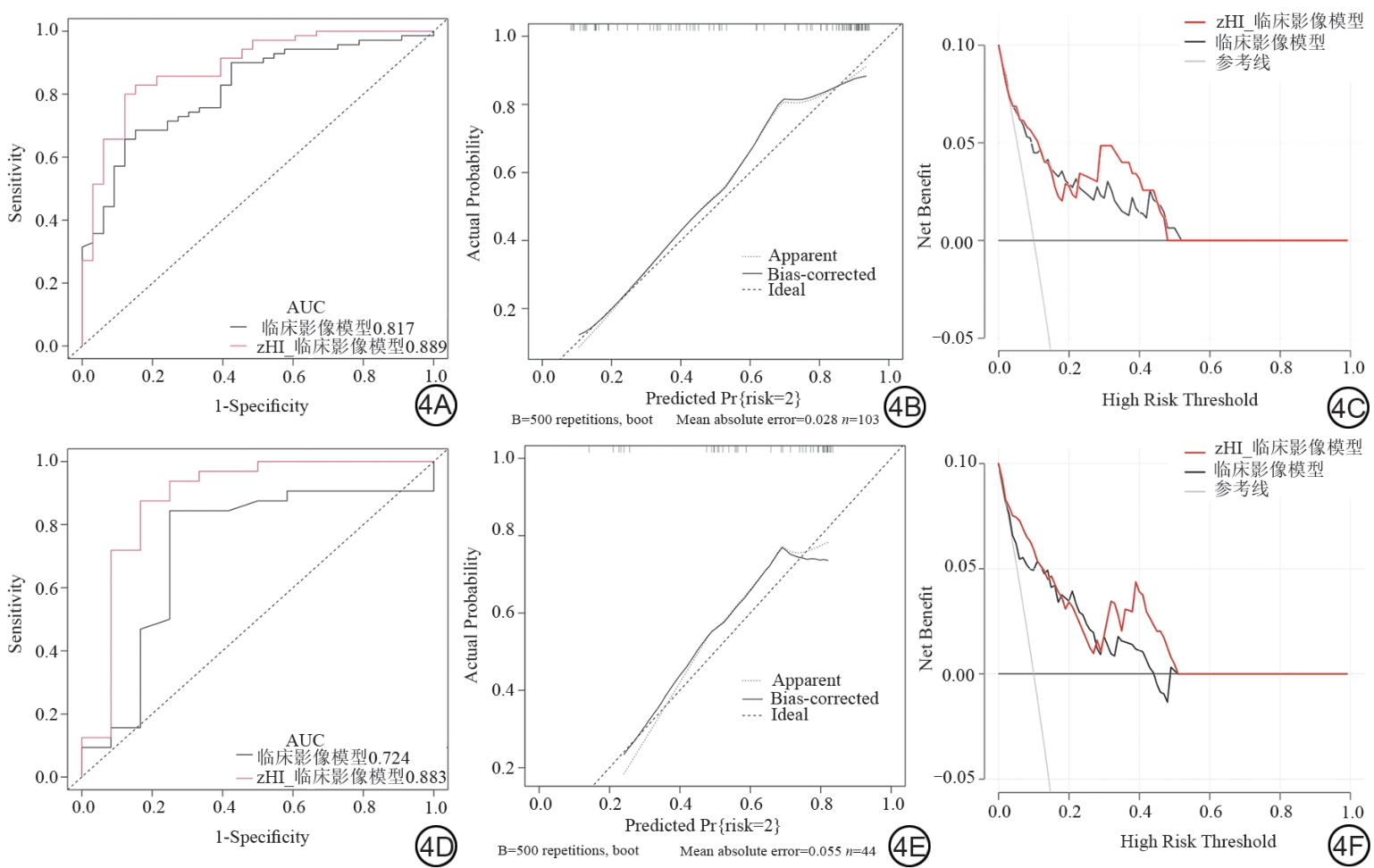 图4  模型在训练集(4A~4C)和测试集(4D~4F)中预测效能的评估与验证。4A、4D:受试者工作特征曲线;4B、4E:校准曲线;4C、4F:临床决策曲线分析。AUC:曲线下面积;zHI:基于分区的生境成像。