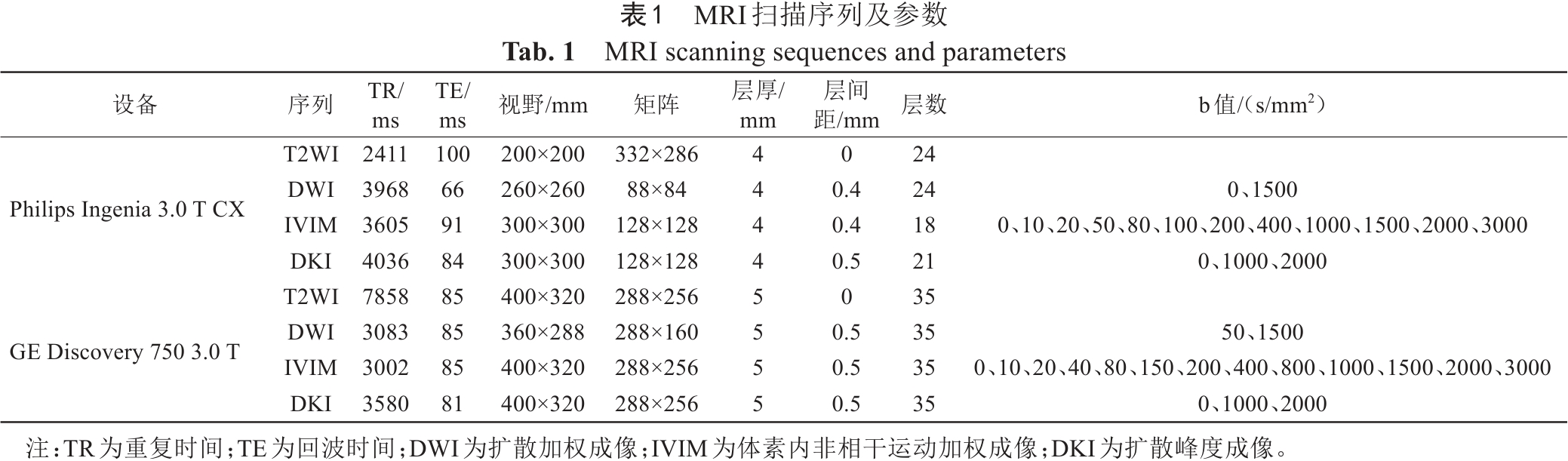 所有患者在Philips Ingenia 3.0 T CX或GE Discovery 750 3.0 T MRI设备上扫描,分别采用16或8通道腹部相控线圈。患者检查前禁食水4~6 h,检查时仰卧位,适度充盈膀胱,尽量排气以减少肠气伪影,扫描范围包括整个盆腔。扫描序列包括T2加权成像、扩散加权成像、体素内非相干运动加权成像及扩散峰度成像(表1)。将图像分别传输至Intellispace Portal或GE Advantage工作站,拟合各b值扩散加权成像(diffusion-weighted imaging, DWI)并生成ADC图。通过MITK(Medical Imaging Interaction Toolkit, Germany)拟合每体素扩散模型,分别从体素内非相干运动加权成像和扩散峰度成像获取灌注分数(perfusion fraction, f)和平均峰度(mean kurtosis, MK)图。