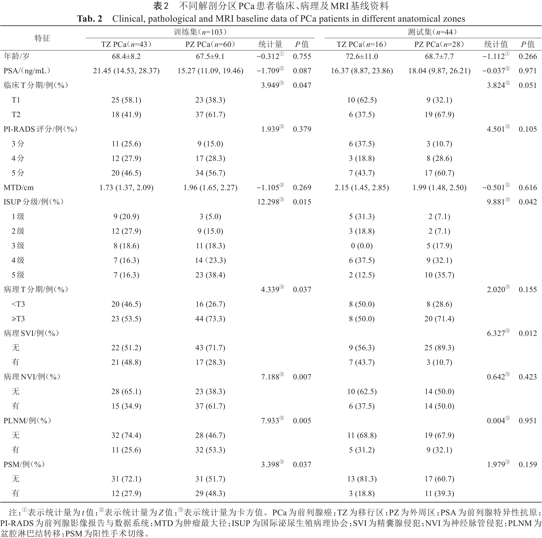147例PCa患者中,低危组45例,高危组102例;PZ PCa 88例,TZ PCa 59例;训练集103例,测试集44例,各组年龄差异无统计学意义(P>0.05)。相较于TZ,PZ PCa患者的临床T分期、ISUP分级、病理T分期、NVI、PLNM和PSM发生率均显著更高,而SVI发生率显著更低(P<0.05)(表2)。
