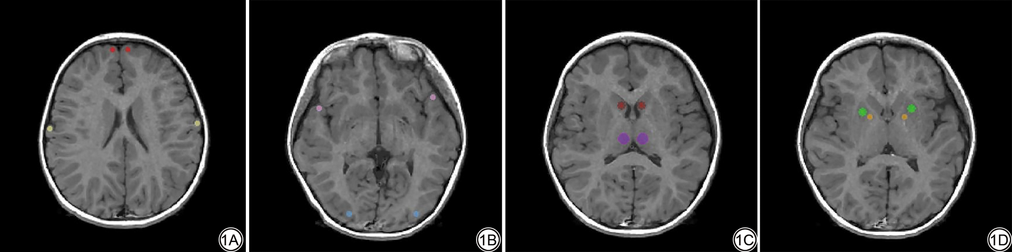 图1  在SyMRI定量图中勾画ROI的示意图。1A:红色为额叶灰质;黄色为顶叶灰质;1B:粉色为颞叶灰质;蓝色为枕叶灰质;1C:棕色为尾状核头;紫色为丘脑;1D:绿色为壳核;橙色为苍白球。SyMRI:集成磁共振成像;ROI:感兴趣区。