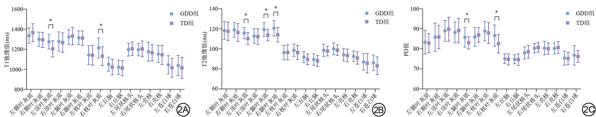 与TD组相比,GDD组在左侧顶叶灰质、右侧枕叶灰质T1弛豫值增高(P<0.003),见表2图2A;左侧顶叶灰质、双侧颞叶灰质T2弛豫值增高(P<0.003),见表2图2B;左侧颞叶灰质和右侧枕叶灰质PD值增高(P<0.003),见表3图2C。两组在双侧额叶灰质、尾状核头、苍白球、壳核和丘脑及右侧顶叶灰质、左侧枕叶灰质的T1、T2弛豫值和PD值差异均无统计学意义(P均>0.003)。