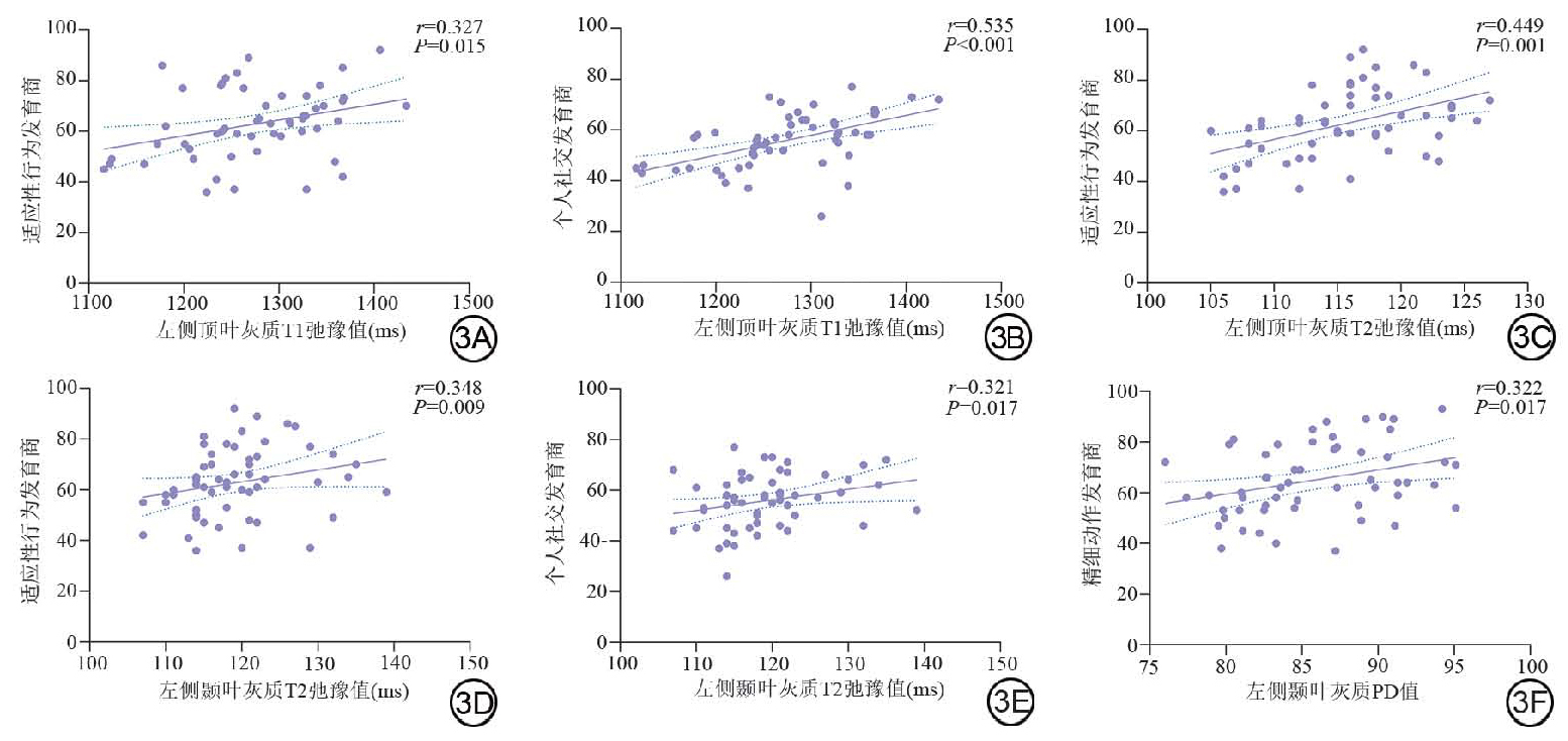 结果显示,左侧顶叶灰质T1弛豫值分别与适应性行为发育商及个人社交行为发育商成正相关(r=0.327,P=0.015;r=0.535,P<0.001);左侧顶叶灰质T2弛豫值与适应性行为发育商成正相关(r=0.449,P=0.001);左侧颞叶灰质T2弛豫值分别与适应性行为发育商及个人社交发育商成正相关(r=0.348,P=0.009;r=0.321,P=0.017);左侧颞叶灰质PD值与精细动作发育商成正相关(r=0.322,P=0.017)。详见图3