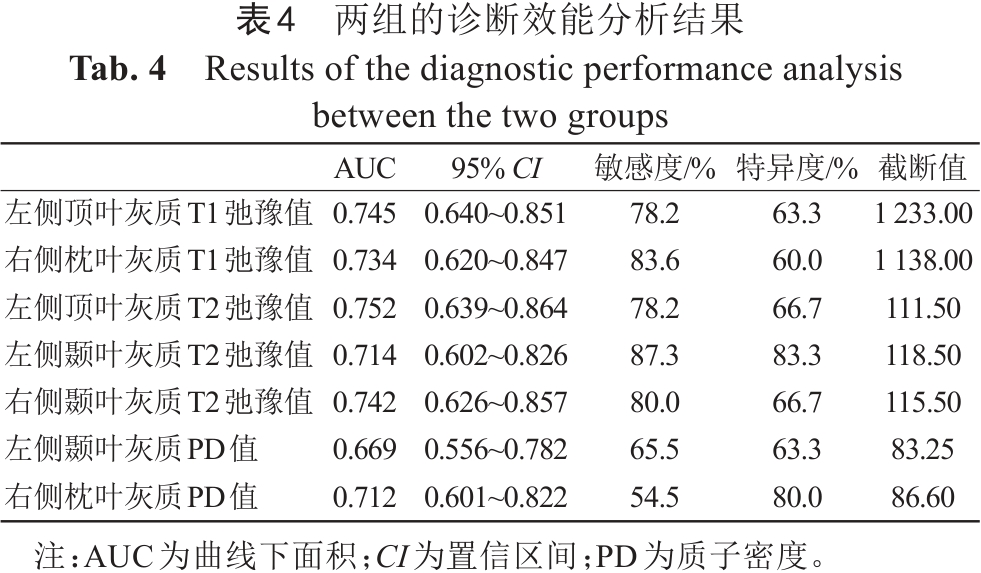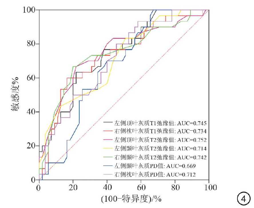 本研究的ROC结果显示左侧顶叶灰质、右侧枕叶灰质T1弛豫值;左侧顶叶灰质、左侧颞叶灰质、右侧颞叶灰质T2弛豫值和右侧枕叶灰质PD值均在GDD儿童的诊断中具有一定的价值(AUC>0.7)。特定脑区的T1、T2弛豫值和PD值在一定程度上可以作为GDD的潜在诊断指标,为临床诊断提供了新的思路和方法。
