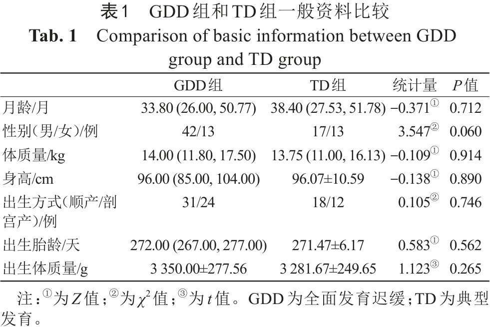 收集GDD组儿童和TD组儿童的一般临床资料,包括检查时月龄、性别、体质量、身高、出生方式、出生胎龄和出生体质量。
