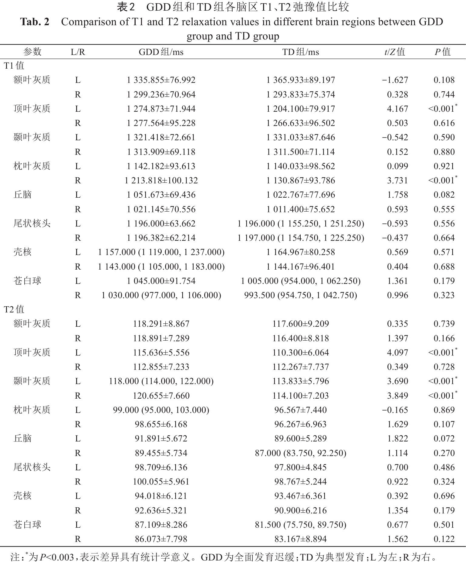 Tab. 2  Comparison of T1 and T2 relaxation values in different brain regions between GDD group and TD group