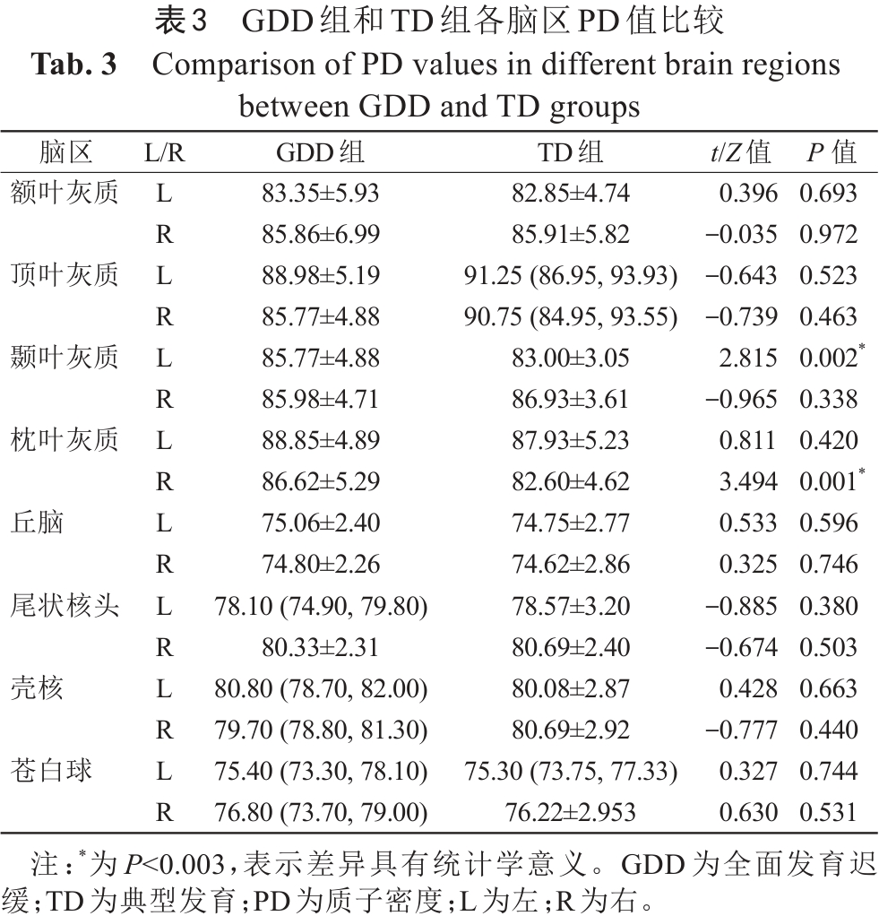 Tab. 3  Comparison of PD values in different brain regions between GDD and TD groups