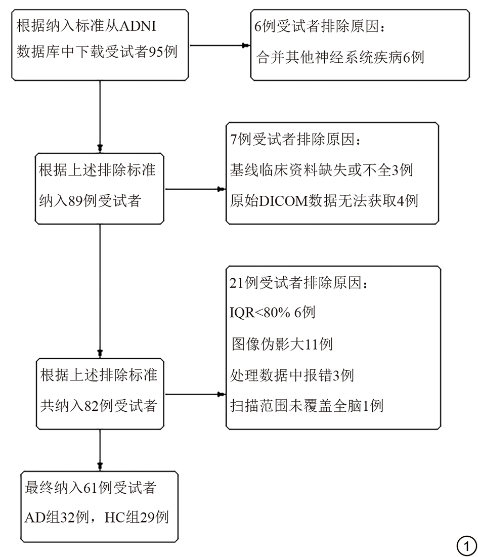 本研究根据纳入标准随机从ADNI数据库中获取影像数据95例。随后,根据排除标准对获取的数据进行逐一排除。所有数据的筛选工作由两名具有5年以上神经影像工作经验的主治医师完成。若评估出现分歧,双方将通过协商达成一致意见。经过严格的质控与筛选,最终确定61例受试者纳入分析,包括AD患者32例与HC组29例。具体选择流程见图1