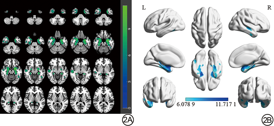 Fig. 2  Brain regions withdifferences in GMV between the AD and HC groups. Cool-colored areas in panels 2A to 2B represent regions of reduced GMV in the AD group. GMV: gray matter volume; AD: Alzheimer's disease; HC: healthy control.