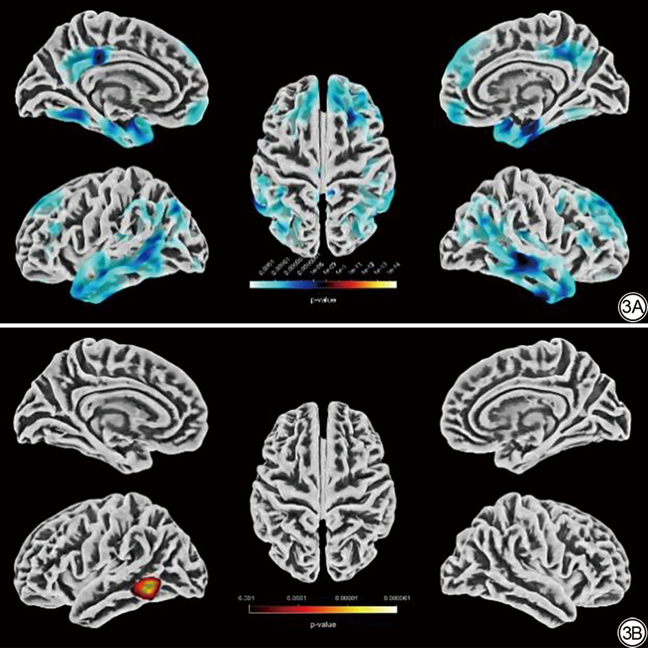 图3  AD组和HC组组间皮层表面形态有差异的脑区。3A:冷色区域表示皮层厚度减低的脑区;3B:暖色区域表示皮层局部回指数增加的脑区。颜色编码数值代表P值(团块水平FWE校正,P<0.05)。HC:健康对照;AD:阿尔茨海默病。
