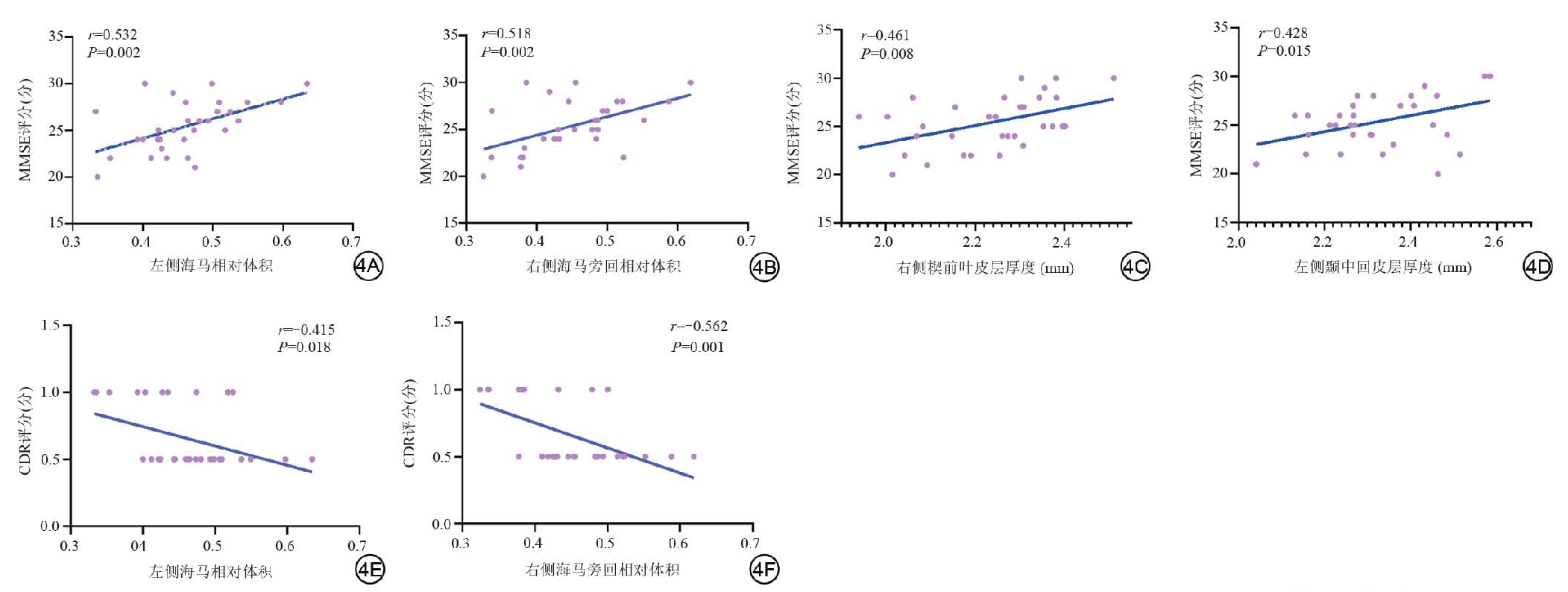图4  AD组灰质体积及皮层表面指标值与认知量表的相关性。4A~4D分别表示MMSE 评分与左侧海马体积、右侧海马旁回体积、右侧楔前叶皮层厚度、左侧颞中回皮层厚度呈正相关;4E~4F 分别表示CDR 评分与左侧海马体积、右侧海马旁回体积呈负相关。AD:阿尔茨海默病;MMSE:简易精神状态检查量表;CDR:临床痴呆评定量表。