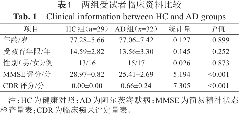 在人口统计学资料中,年龄、受教育年限、性别在AD组和HC组的差异无统计学意义(P>0.05);在神经心理学评估中,AD组MMSE评分低于HC组(P<0.001),CDR评分高于HC组(P<0.001)(表1)。