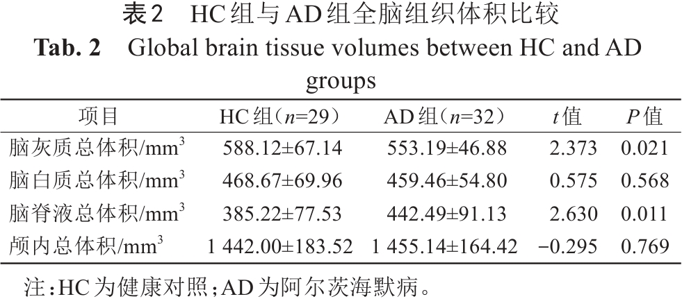 AD组脑灰质总体积低于HC组(P=0.021),AD组脑脊液总体积高于HC组(P=0.011),两组脑白质总体积、颅内总体积差异均无统计学意义(P>0.05)(表2)。
