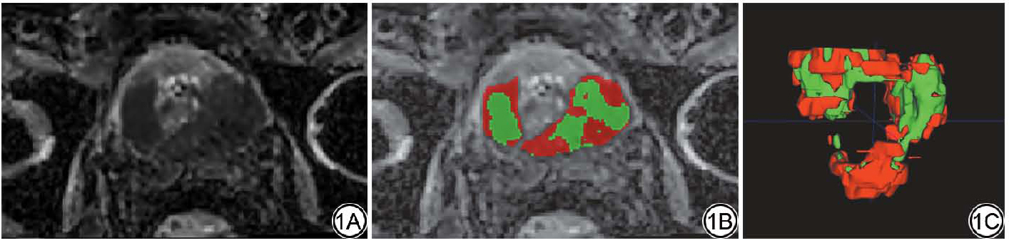 Fig. 1  Male, 70 years old, prostate cancer, Gleason score 4+4, intratumoral heterogeneity score 1A: apparent diffusion coefficient image; 1B: Single-slice subregion generation results, with red representing h1 subregion and green representing h2 subregion; 1C: Habitat subregion distribution map in space.