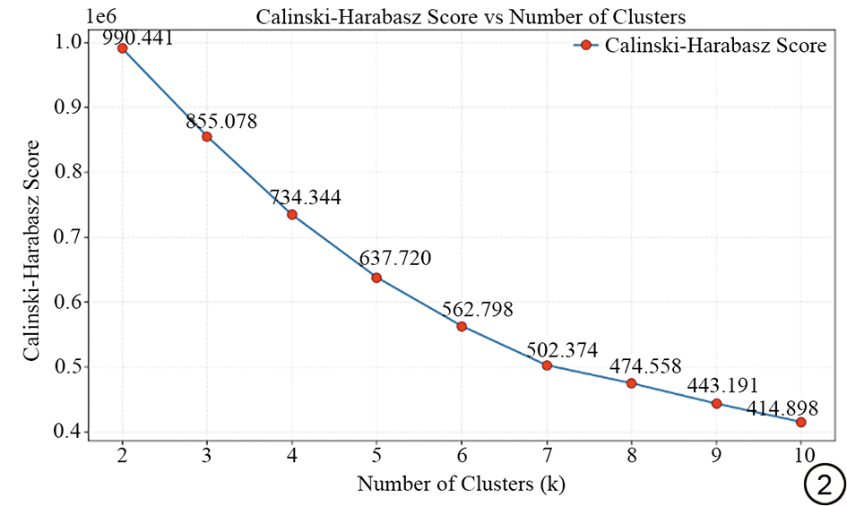 Fig. 2  The Calinski-Harabasz (CH) value evaluates clustering results and selects the optimal number of clusters (k=2), with the horizontal coordinate representing the number of clusters k and the vertical coordinate representing the CH value.