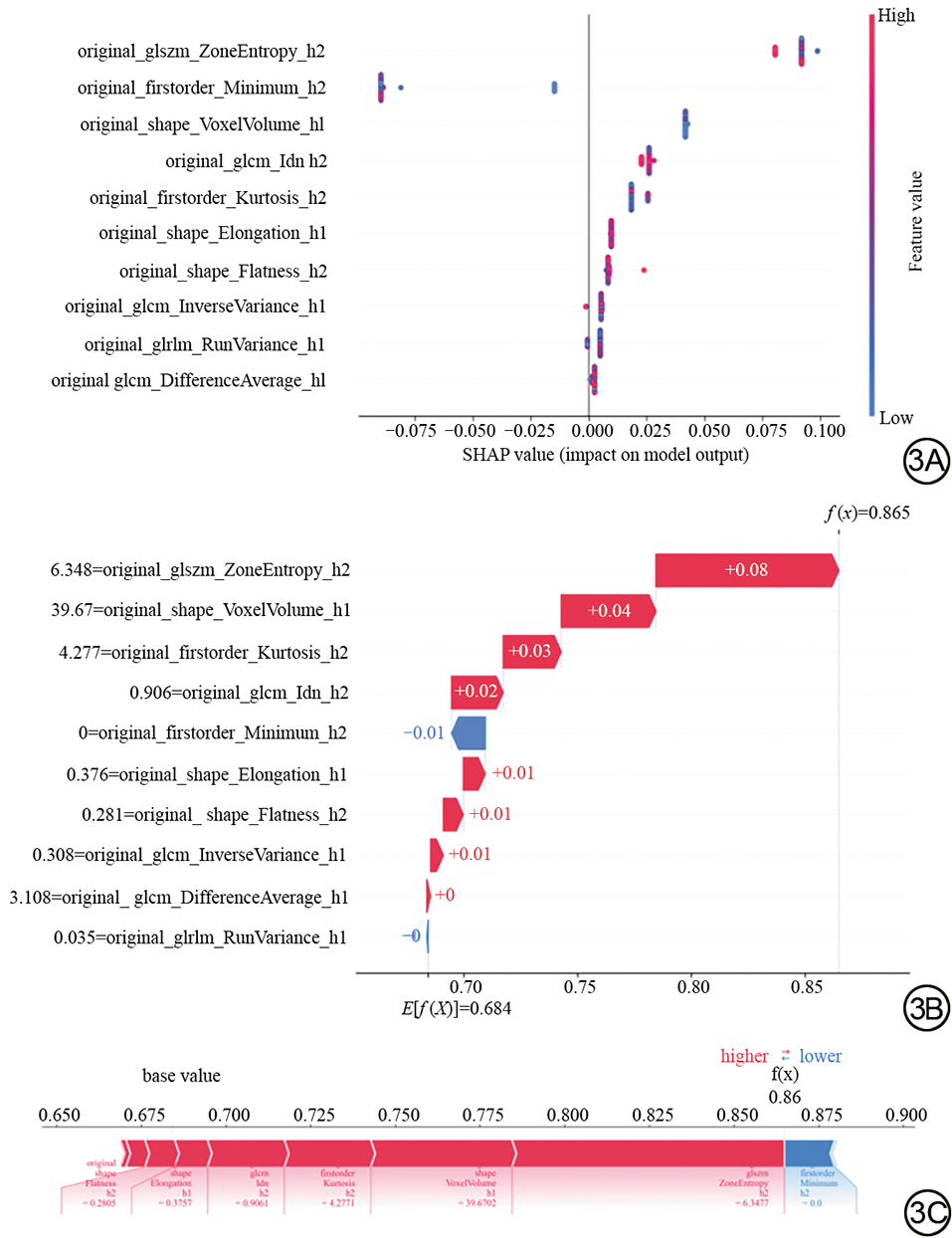 图3  生境影像组学模型利用SHAP进行总样本及单一样本分析。3A:SHAP全局图,显示了每个特征与SHAP值之间的相关性;3B:SHAP瀑布图,显示单个样本的预测值红色代表正向影响,蓝色代表负向影响;3C:SHAP力图,显示单个样本的SHAP表示最终预测值为0.86,高于基准值,预测病灶为高风险前列腺癌。