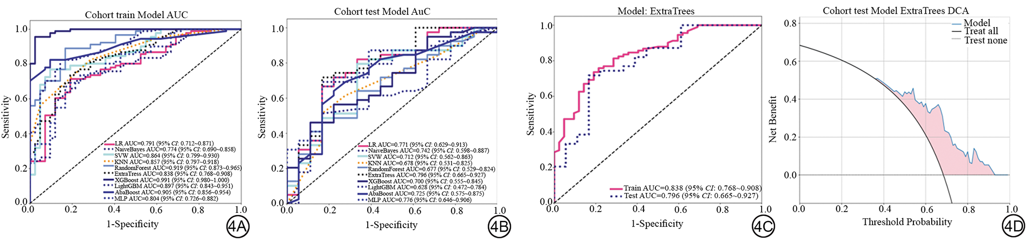 图4  生境成像影像组学模型的ROC曲线。4A~4B:生境影像组学模型在训练集(4A)和测试集中(4B)的ROC曲线;4C:最佳预测模型ExtraTrees在训练集和测试集中的ROC曲线;4D:最佳预测模型ExtraTrees在测试集中的校准曲线图。ROC:受试者工作特征;ExtraTrees:极端随机树。