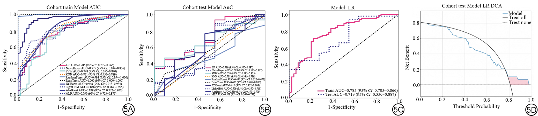 图5  临床+PI-RADS模型ROC曲线。5A~5B:临床+PI-RADS模型在训练集(5A)和测试集中(5B)的ROC曲线;5C:最佳预测模型LR在训练集和测试集中的ROC曲线;5D:最佳预测模型LR在测试集中的校准曲线图。ROC:受试者工作特征;LR:逻辑回归。