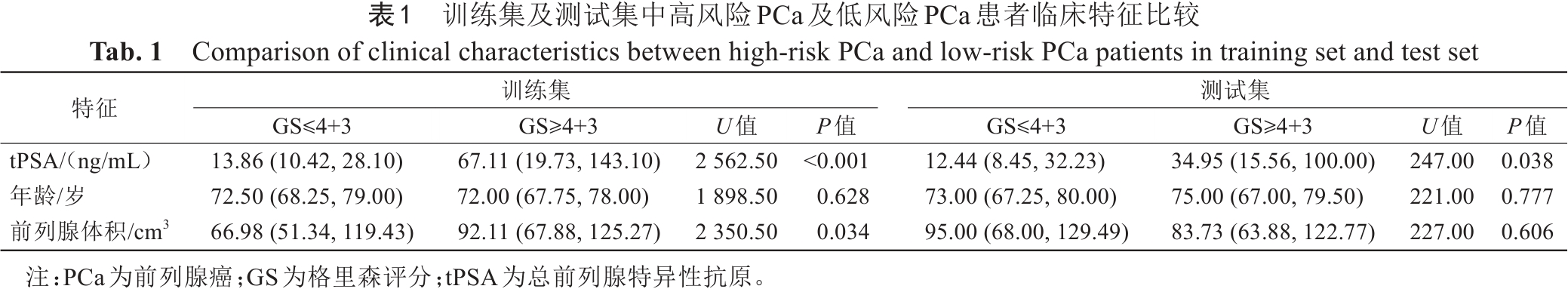 表1  训练集及测试集中高风险PCa及低风险PCa患者临床特征比较