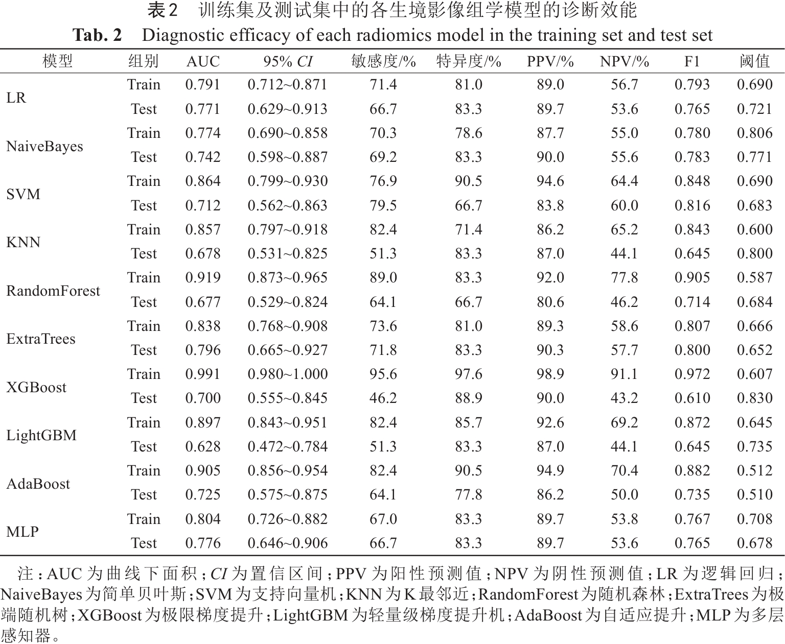 Tab. 2  Diagnostic efficacy of each radiomics model in the training set and test set