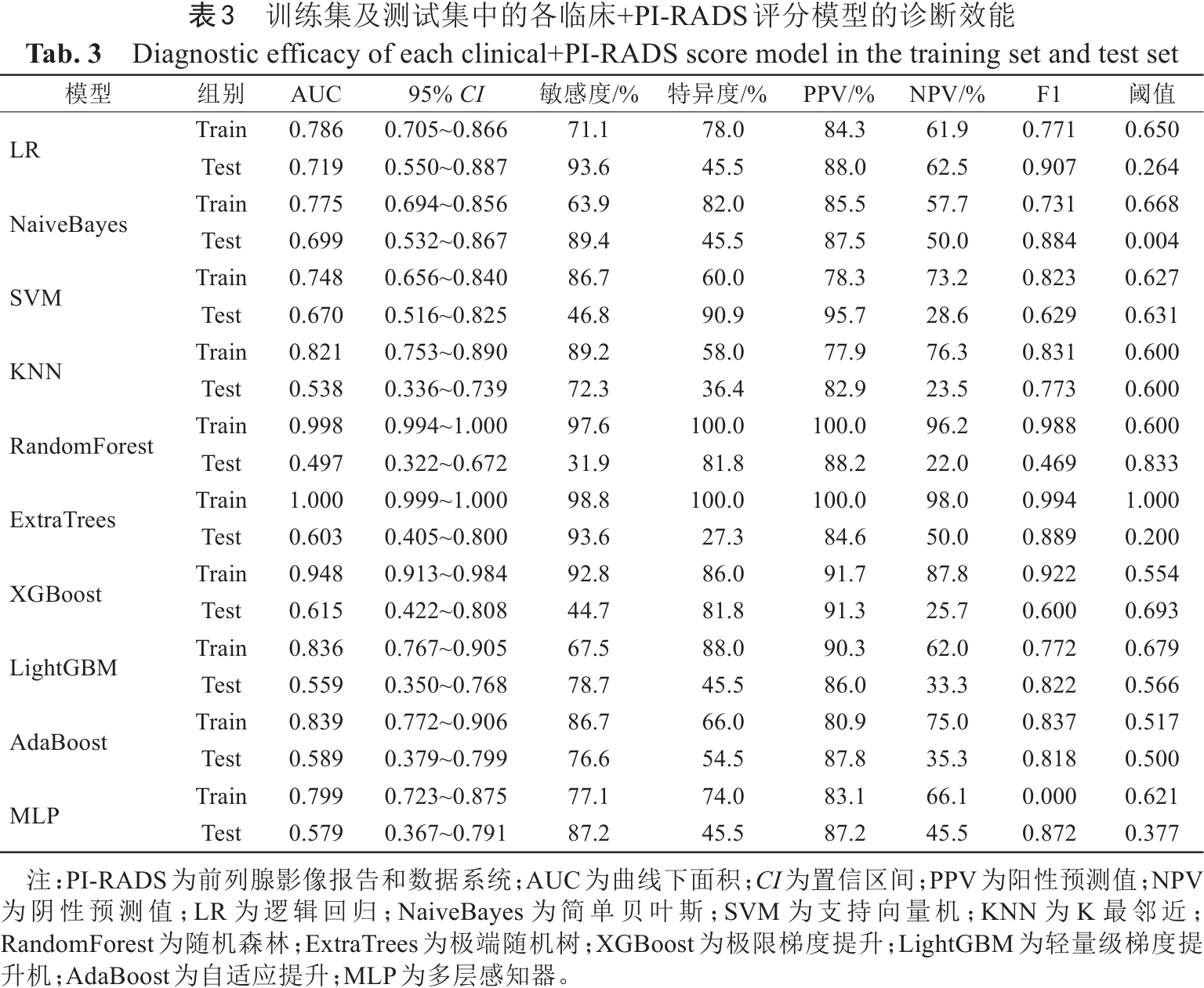 Tab. 3  Diagnostic efficacy of each clinical+PI-RADS score model in the training set and test set