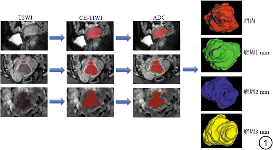 子宫内膜癌(endometrial carcinoma, EC)是发生于子宫内膜上皮的一种恶性肿瘤,在国内约占妇科恶性肿瘤的20%~30%,近年来发病率和死亡率呈上升趋势[1],在部分发达城市已居妇科恶性肿瘤之首[2]。淋巴脉管间隙浸润(lymphovascular space invasion, LVSI)是指癌细胞侵犯瘤内及瘤周的淋巴或血管[3]。LVSI阳性患者术后易出现复发转移[4, 5]是影响预后的高危特征之一[6, 7]。2020年WHO根据肿瘤累及血管的数量将LVSI分为广泛、局灶及无侵犯三种类型,其中广泛LVSI定义为累及≥5支血管[8, 9]。广泛LVSI是影响盆腔区域复发、远处转移和总体生存率的最强独立预后因素,可直接影响患者的手术方案[10],因此术前准确评估LVSI的程度具有重要意义。目前对LVSI的评估仍依赖术后病理切片镜下检查,术前活检有创且具有一定的假阴性率,且所取局部组织很难准确判断肿瘤的整体特征[11]。基于MRI的影像组学具有无创、客观、可重复的特点,可以定量反映肿瘤的全面信息[12]。以往对EC的LVSI状态研究多聚焦于肿瘤内部[13, 14, 15],缺乏对瘤周组织特征的评估。近期有研究基于弥散加权成像(diffusion-weighted imaging, DWI)、T1WI增强序列及T2WI序列的瘤内及瘤周影像组学建立模型,预测效能较前提高,证明肿瘤周围微环境也可以提示病变的临床行为[16]。然而少有研究采用可以准确反映肿瘤血管特征的增强及ADC序列瘤内瘤周特征评估EC的LVSI状态。因此本研究旨在探讨基于T1WI增强后的延迟期等多序列MRI的瘤内及瘤周影像组学对EC的LVSI状态的预测价值,为术前无创识别EC的LVSI特征提供新的思路,指导临床在术前选择合适的治疗方案。