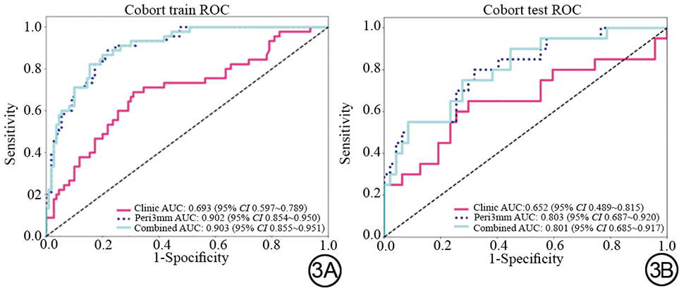 图3  各模型在训练集(3A)和验证集(3B)的ROC曲线。Clinic:临床模型;Peri3mm:T2WI瘤周3 mm影像组学模型;Combined:T2WI瘤周3 mm的影像组学与临床独立危险因素结合建立的联合模型;ROC:受试者工作特征;AUC:曲线下面积。