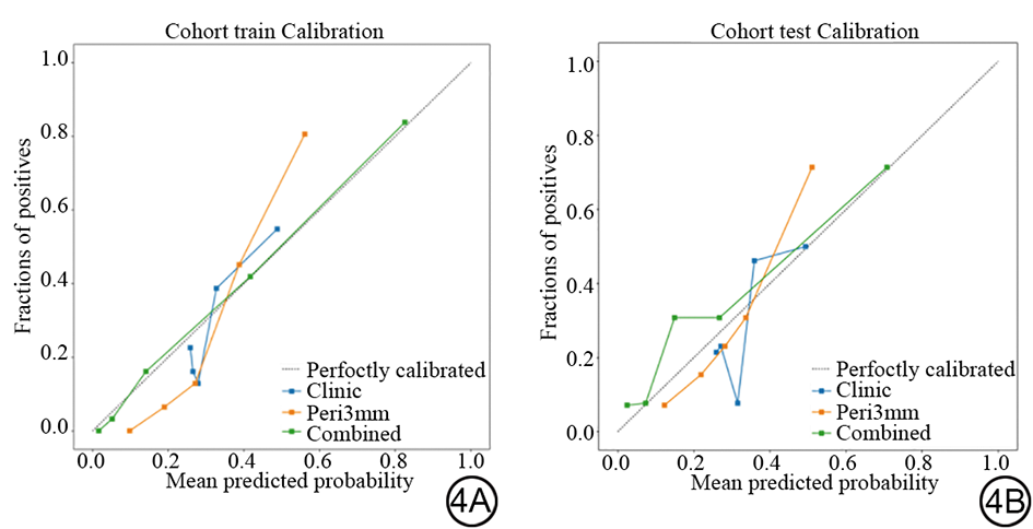 图4  各模型在训练集(4A)和验证集(4B)中的校准曲线。Clinic:临床模型;Peri3mm:T2WI瘤周3 mm影像组学模型;Combined:T2WI瘤周3 mm的影像组学与临床独立危险因素结合建立的联合模型。