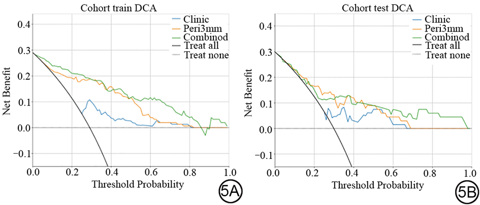 图5  各模型在训练集(5A)和验证集(5B)中的决策曲线分析(DCA)。Clinic:临床模型;Peri3mm:T2WI瘤周3 mm影像组学模型;Combined:T2WI瘤周3 mm的影像组学与临床独立危险因素结合建立的联合模型。