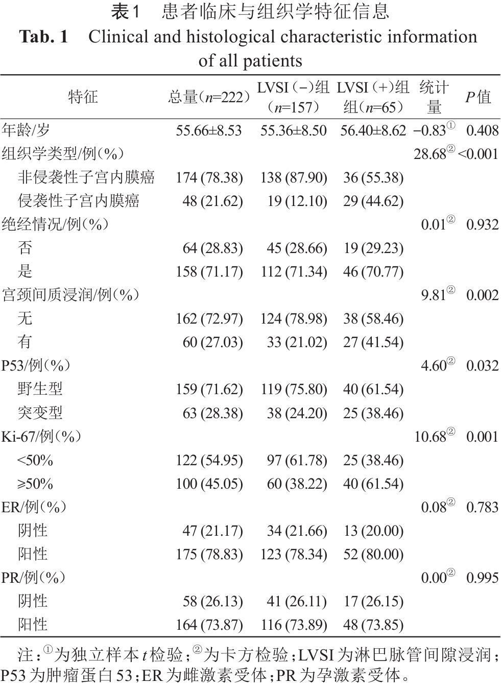 由术后组织病理学证实LVSI状态,术前刮除组织病理检查确定宫颈间质浸润情况、p53、Ki-67、雌激素受体(estrogen receptor, ER)、孕激素受体(progesterone receptor, PR)状态及组织学类型。