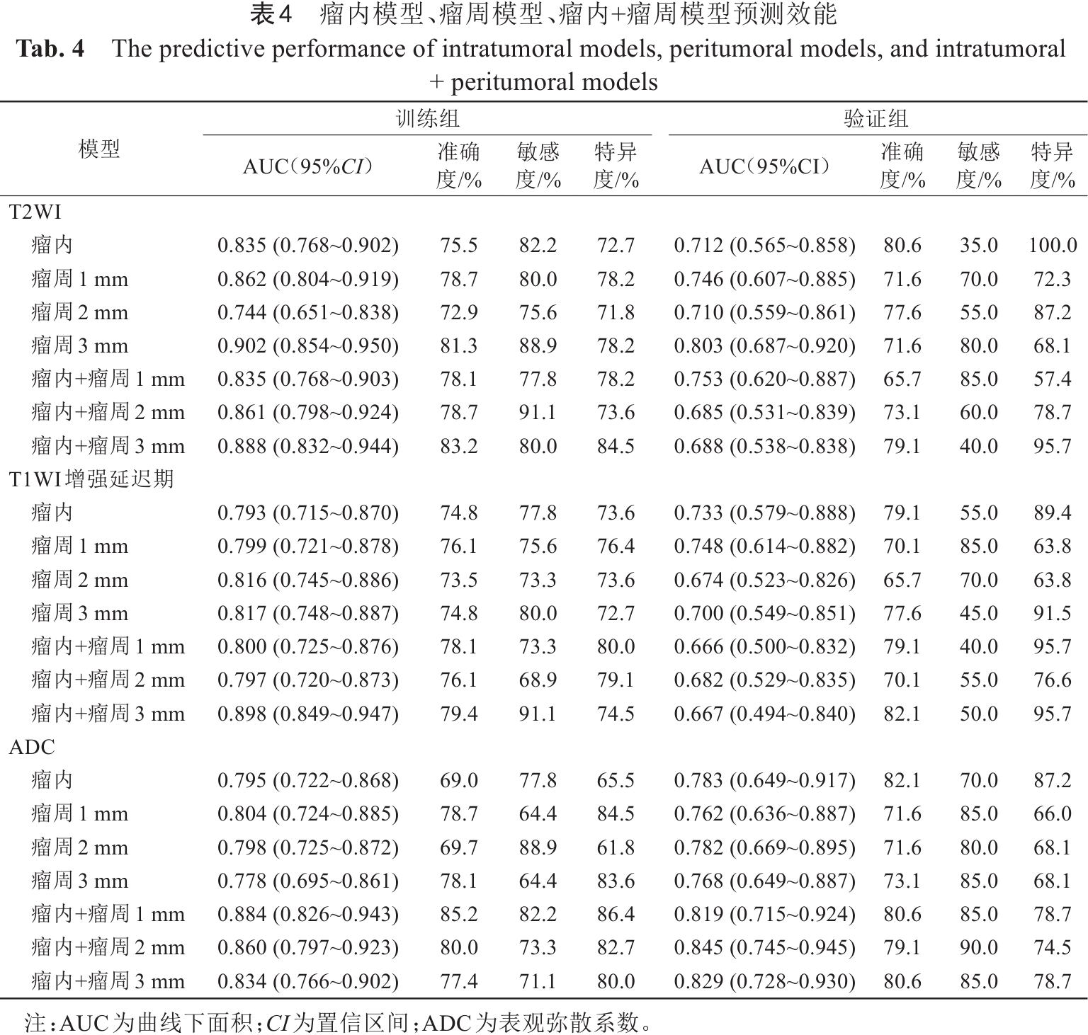 表4  瘤内模型、瘤周模型、瘤内+瘤周模型预测效能