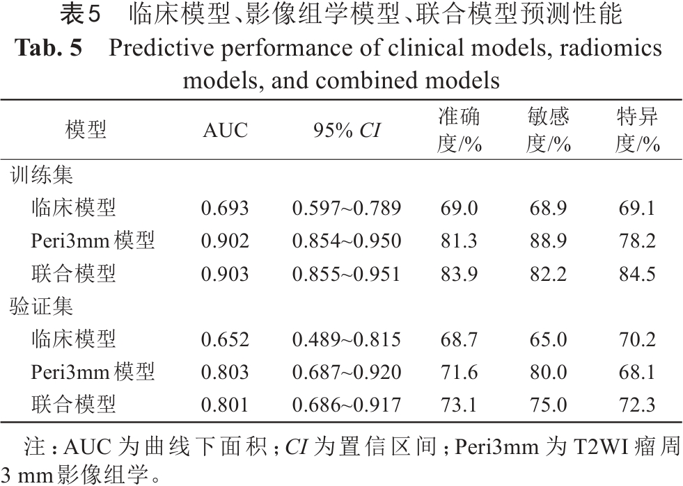 依据各序列模型结果所示AUC、准确度、敏感度以及特异度(表4),瘤内模型在T2WI序列中表现出最好的性能,训练集AUC为0.835(95% CI:0.768~0.902),验证集AUC为0.712(95% CI:0.565~0.858);T2WI中从肿瘤边缘向外扩展3 mm的瘤周模型具有最佳性能,训练集AUC为0.902(95% CI:0.854~0.950),验证集AUC为0.803(95% CI:0.687~0.920);在瘤内+瘤周模型,ADC序列上瘤内+瘤周1 mm模型性能最优,训练集AUC为0.884(95% CI:0.826~0.943),验证集AUC为0.819(95% CI:0.715~0.924),最终选择T2WI瘤周3 mm模型作为最佳影像组学模型,用于进一步建立联合模型。