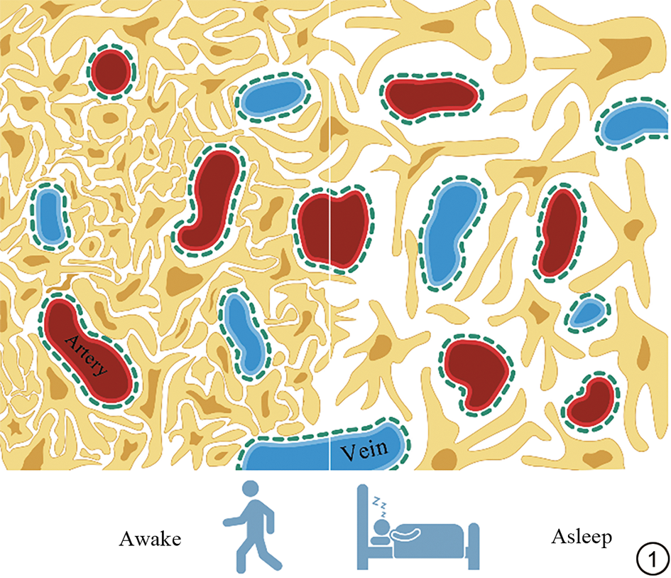 Fig. 1  The effects of sleep and wakefulness on cerebrospinal fluid dynamics, interstitial space volume, and metabolic waste clearance efficiency. During wakefulness, the interstitial space is reduced, cerebrospinal fluid flow is diminished, and metabolic waste products accumulate; During sleep, the interstitial space expands, cerebrospinal fluid flow is augmented, and metabolic waste products are efficiently cleared.