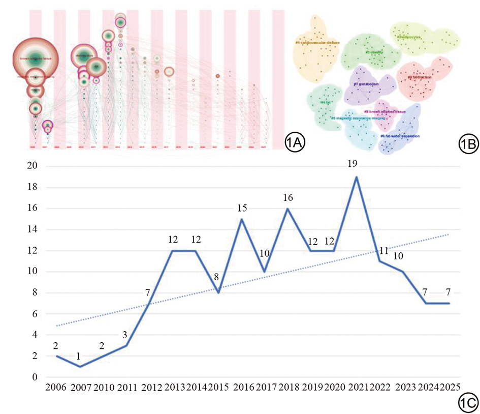 Fig. 1  Bibliometric and visualized analysis of the research landscape in brown adipose tissue with magnetic resonance imaging. 1A: Keyword clustering timeline map of the research in brown adipose tissue with magnetic resonance imaging research; 1B: Visualization of clustering results;1C:Annual publication trends on MRI-based brown adipose tissue research between 2006 and 2025. The annual number of publications reached its peak in 2021.