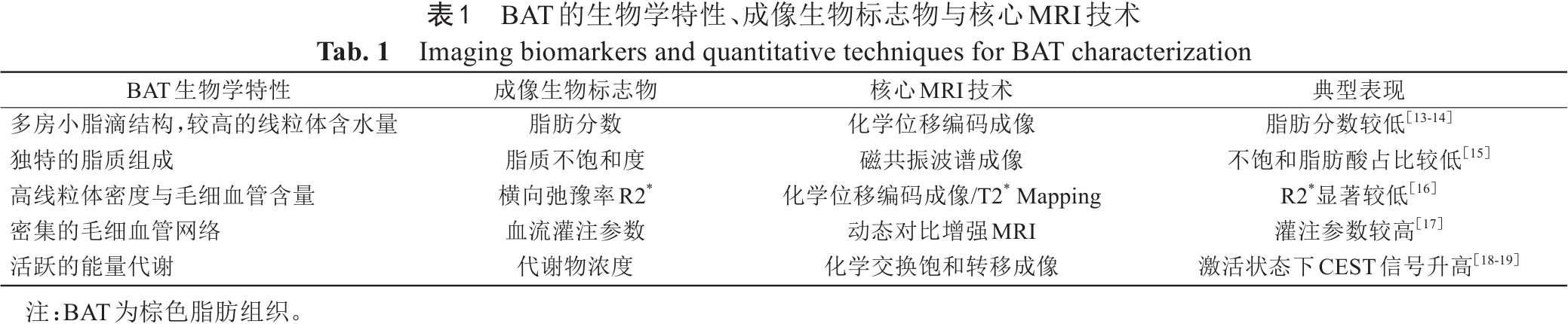 表1  BAT的生物学特性、成像生物标志物与核心MRI技术